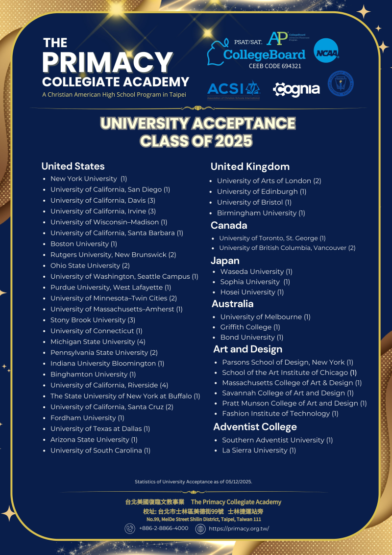 您知道 AP 課程是一個有效提升大學申請和 GPA 的途徑嗎?進階先修課程(AP 課程)是高中生可以選修的高等教育級別課程。這些課程採用 5.0 的加權方式,而非傳統的 4.0 加權,因此在這些課程中取得優異的成績,能顯著提高您的 GPA。此外,這些課程也可以用於大學雙學分計畫,幫助您在大學期間節省寶貴的時間和學費。Primacy 是台北少數獲得 Collegeboard 認可的 AP 考試中心之一。在這裡上 AP 課程,為上大學做好準備。